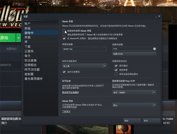 2.在设置页面中点击左侧栏的游戏中,随后勾选设置页面上方的【在游戏中启用steam页面】,这样便可以开启使用steam overlay。