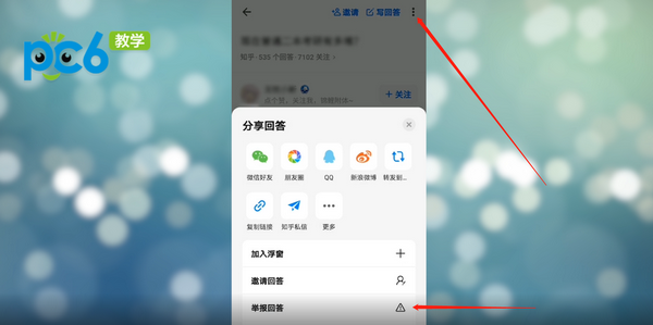 在界面的右上角有一个菜单的按钮,点击该按钮。界面的下方会弹出许多的功能选项,其中就有一个举报回答的选项,点击该选项。