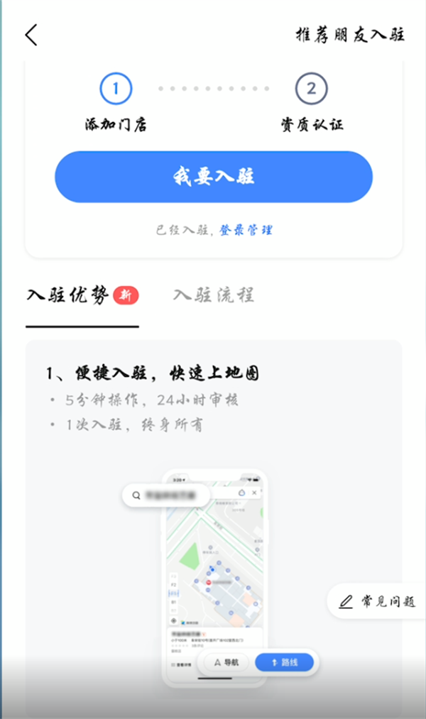 在入驻界面中先后填入店铺名称、地图具体位置、门脸照片、营业时间和营业电话即可完成店铺基本信息。而且店铺的门店照片需要室内照片、室外照片和周边环境照片,照片越多就越能确认店铺的位置,所填写的信息都能帮助用户找到店铺的具体地点。