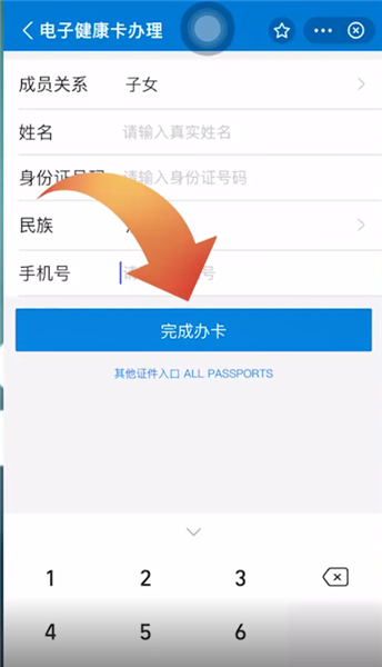 第三步:在成员关系处选择成员关系,接下来输入姓名、身份证号码和手机号,再点击完成办卡即可。