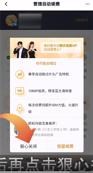 第三步:在已开通的自动续费栏后点击关闭选项,然后再点击狠心关闭即可取消腾讯视频的自动续费了。