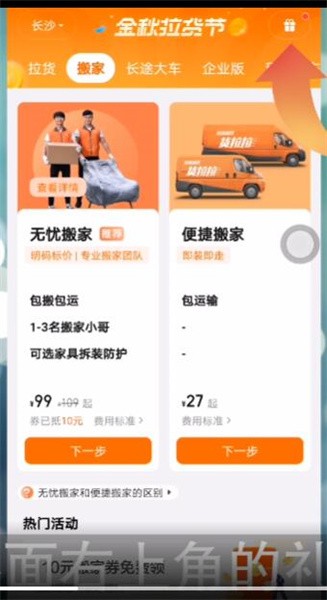 1.打开货拉拉APP,点击首页界面右上角的礼物图标。