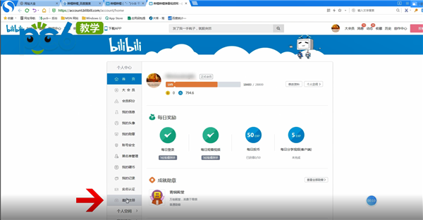 在百度上搜索哔哩哔哩,点击进入网址登录,把鼠标移动到自己的头像上,点击个人中心,