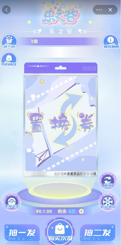 可以看到只有一个售价0.1的置换券,点击进入,购买一次次数然后点击抽一发,就可以获得置换券了