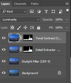 6、和滤镜「Detail Extractor」一样,我也只想「Tonal Contrast」用于建筑物上,做法也是用图层蒙版。 另外把混合模式由正常改为亮度便解决对色彩的影响了。