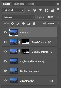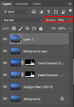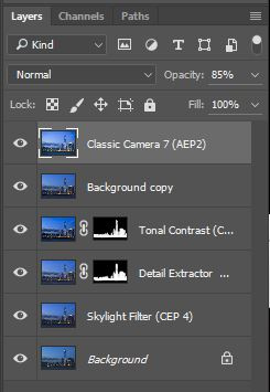 (6)完成后按OK,程序便会自动在Photoshop中加一个已加效果的图层置顶。 这张照片的第一个滤镜用了「Skylight Filter」,这会为照片加强日落、日出的颜色,建议为了避免脱离现实不要用得太强,加了后按OK。