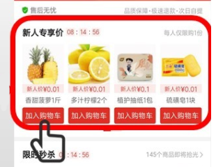 多多买菜在打开的时候会有非常便宜的新人专享福利,能够以1分钱价格买到一些水果或蔬菜,但是它是专为首次使用的新人提供的,所以使用一次之后就不能再用了。