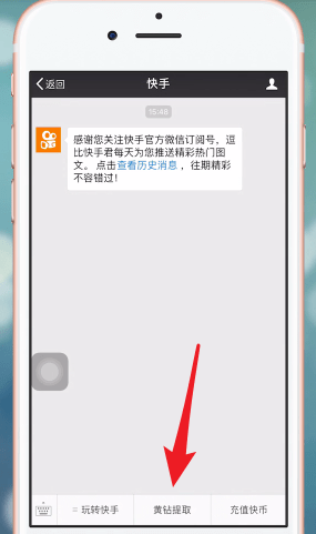 在微信App中打开【快手微信公众号】,点击底部【黄钻提取】;