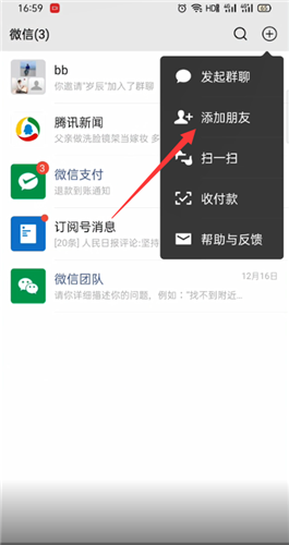 如果知道微信号或者手机号,打开微信,点击右上角的+,
