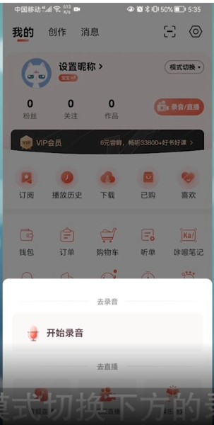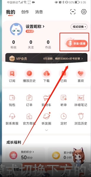 1、打开喜马拉雅选择菜单之中的账号,然后选择模式切换下方的录音和直播。