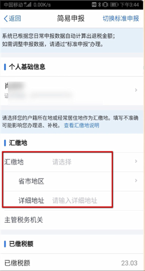 然后阅读须知再点击我已阅读并知晓,在简易申报填写汇缴地,填写完成后点击提交然后勾选我已阅读并同意,