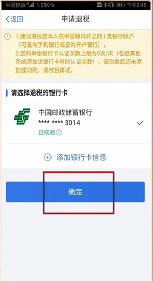 再点击确认提交,接下来点击申请退税,选择退税的银行卡再点击确定,这时等待退税完成就可以了。