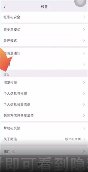 第二步:这时即可看到隐私版块,可以点击朋友权限、个人信息与权限功能进行设置了。