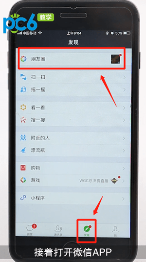 接着打开微信App,选择【发现】页面,打开【朋友圈】;