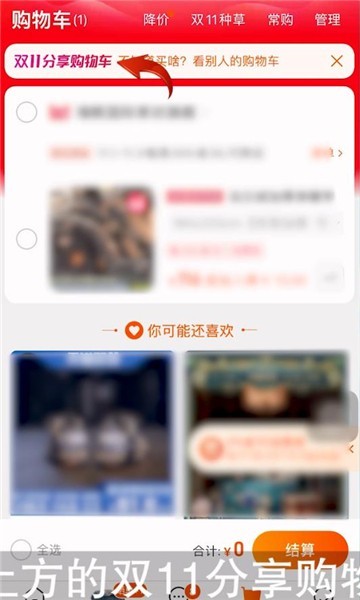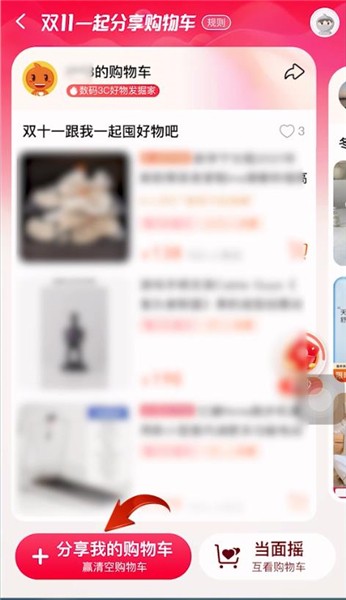 第一步:打开淘宝客户端,然后点击底部的购物车图标,点击页面上方的双11分享购物车活动栏,