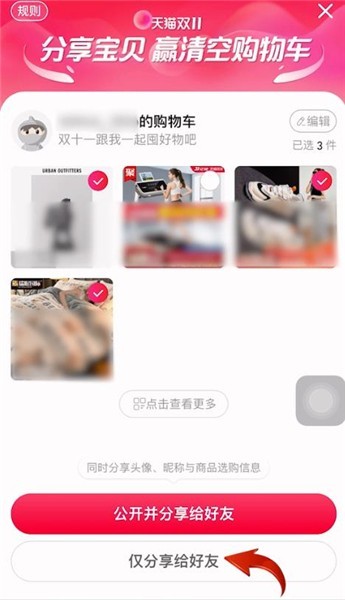 接着点击左下角的【+分享我的购物车】按钮,勾选要分享的商品,