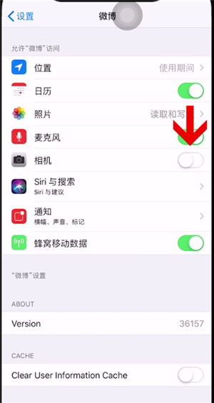 进入设置页面之后滑动屏幕找到微博应用,点击进入微博的权限设置页面之后可以看到相机的设置栏,点击开启按钮就可以了。