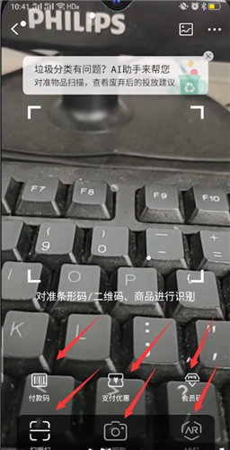 对着这条形码/二维码、商品进行识别,下面就会有可以扫描的二维码类型,付款码、支付优惠、会员码,下面还可以选择扫啊扫、拍照购、ar扫,你也可以点击保存那个有二维码的图片,之后点击右上方的图片,选择哪个有二维码的图片,就可能识别,