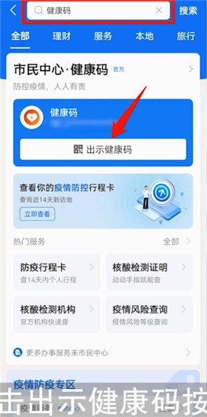 首先打开【支付宝】客户端,然后然后在上方搜索栏搜索“健康码”,点击上方的【出示健康码】按钮,