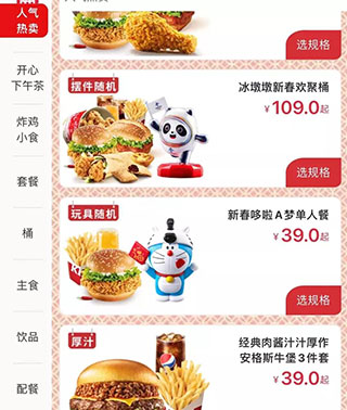 六、肯德基肯德基的新春欢聚桶套餐,里面包含常规的汉堡、可乐、薯条、蛋挞等,还包括随机一款冰墩墩印章摆件,总价109元,冰墩墩几乎就没怎么花钱。缺点是这一款套餐仅在部分省份的门店有售,且仅限堂食,外卖是买不到的,目前很多地方均已无货。