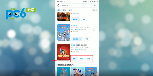 3.在搜索结果的下拉选项之中,会出现播放,下载,详情三个选项按钮。直接点击下载按钮。