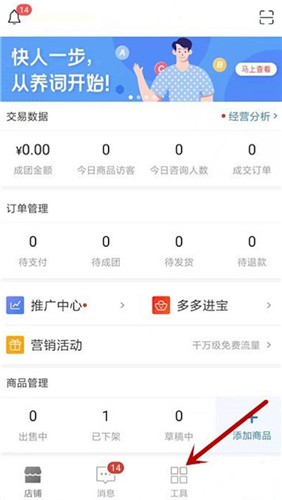 首先打开拼多多商家版,点击工具。