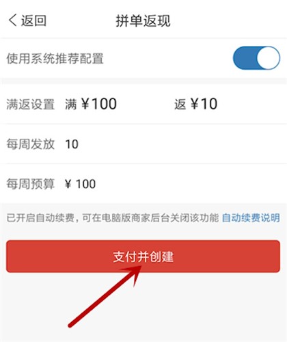 在拼单返现页面可使用系统推荐配置,也可自行设置满反金额以及发放时间,然后点击支付并创建。