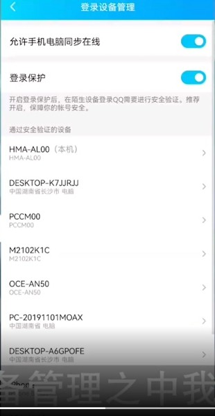 备注:这里的qq登录记录是通过我们的登录保护才会出现的设备记录如果没有通过登录保护那么只能允许登录一次,第二次该设备的记录将会消失。