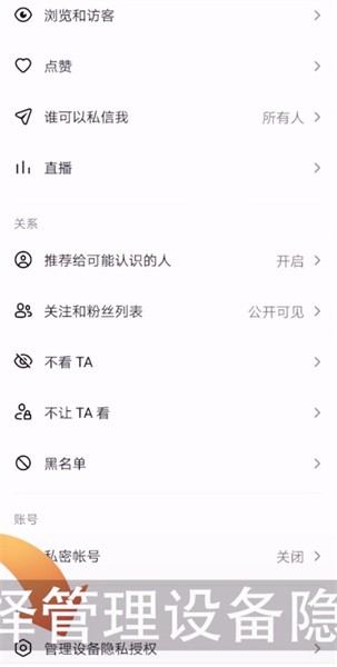4、选择管理设备隐私授权,再点击管理设备通讯录授权;