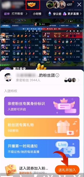 关注主播后,关注按钮就会变成粉丝团的标识,点击标识进入粉丝团详情页面,再点击下方【送礼并加入】,完成支付后即可获得粉丝团资格。