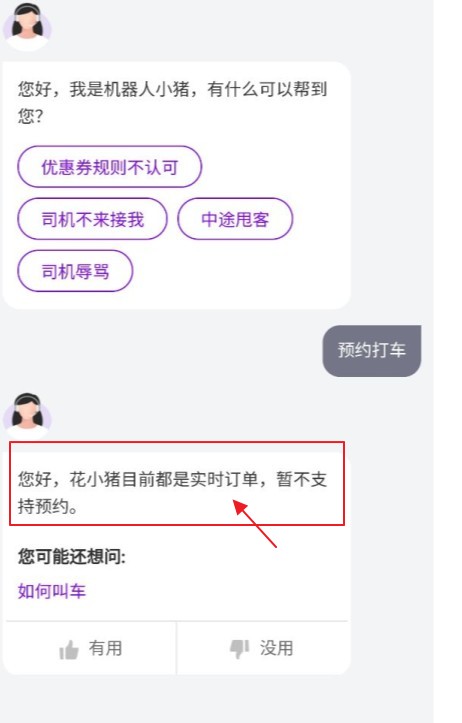 2、点击【联系客服】,输入【预约打车】并发送,此时会收到官方回复,表示目前该平台暂时不支持预约功能,无法预约用车。