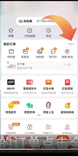 2、在我的淘宝之中选择我的订单点击全部选项。
