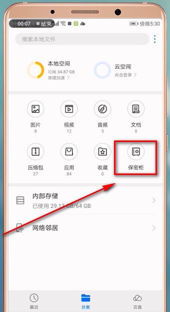 1.首先打开华为手机自带的【文件管理】,然后在【分类】选项中点击【保密柜】