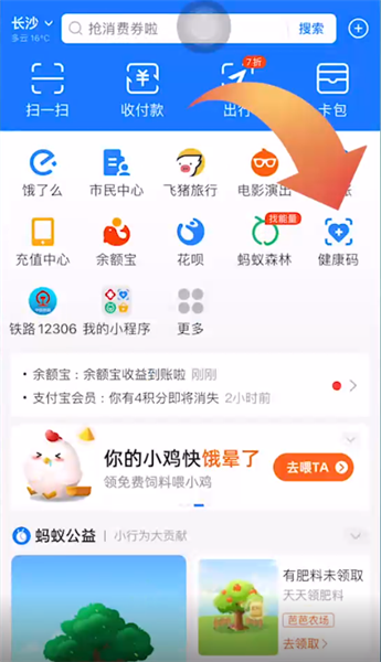 第一步:首先打开支付宝app,在支付宝首页点击健康码选项,