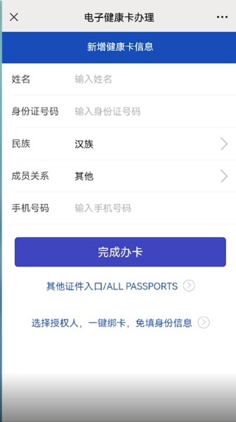3、点击新增健康卡信息然后输入相关身份信息即可在同一手机上查看三张健康码。