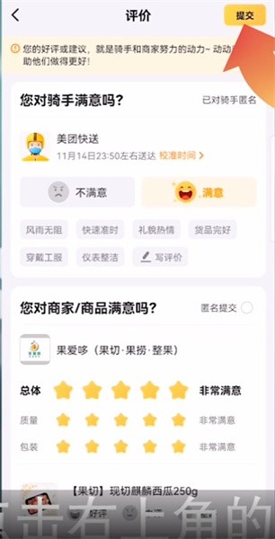 3、对骑手以及卖家商品做出评价,再点击右上角的提交;