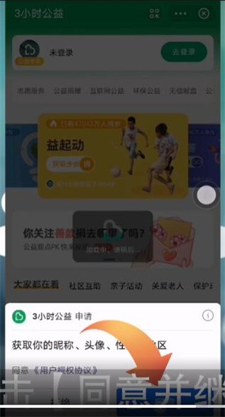 3.点击【同意并继续】,在界面中选择一个公益完成发布的任务即可。