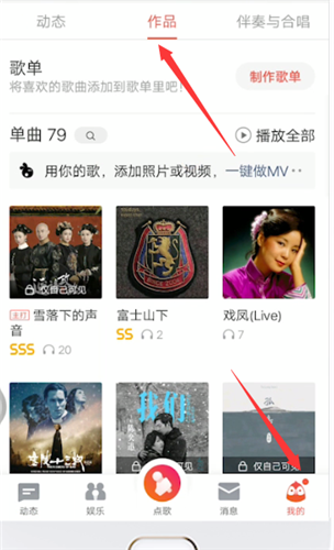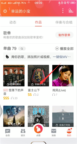 打开手机全民k歌,点击我,点击作品,选择不想让别人听到的作品,进入歌曲的播放页面,