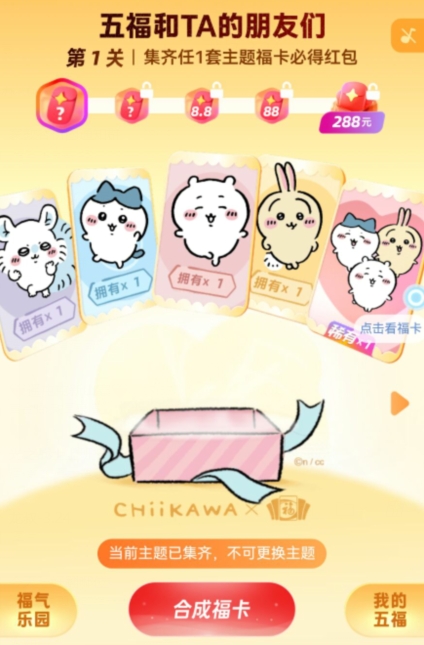 今年的玩法与往年有很大区别,从一套福变成了28套,用户可以发现在选择主题里有28套不同IP的福卡可以选择,囊括各种IP,集齐一套就能立刻开奖,除了红包之外还有各种主题盲盒奖励。