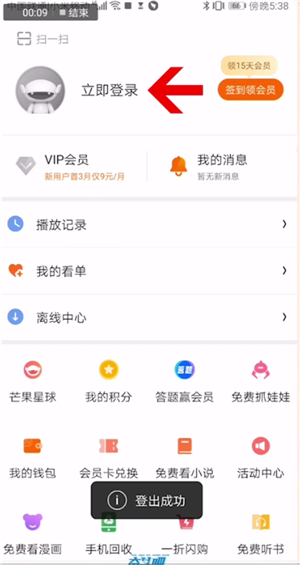 进入设置页面后滑动屏幕到底端点击退出登录原本的账号,退出之后再选择新的账号登陆就切换成功了。可以选择QQ、短信或者芒果账号登录。