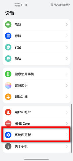 1、打开手机设置,进入“系统和更新”