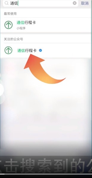 1、打开微信点击上方搜索符号输入通信行程卡。