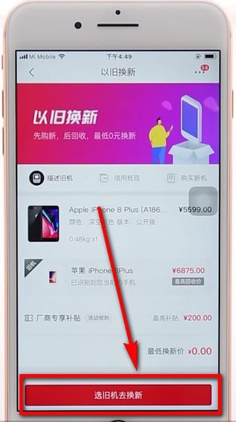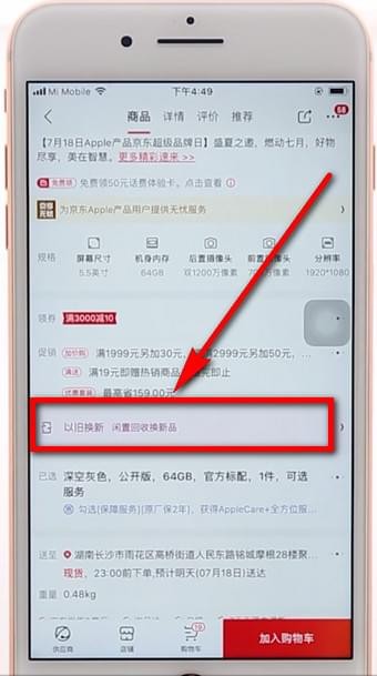 1.首先打开京东商城app,选择想要的新手机,在商品详情页选择以旧换新