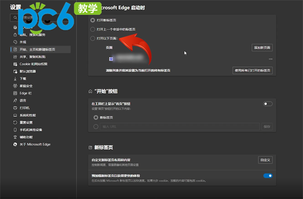 2.在设置页面中点击【开始、主页和新建标签页】,最后点击打开以下页面便可自己输入主页网址,主页网址会变为浏览器的默认主页。