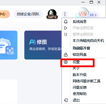 1、进入PC版的百度网盘,选择头像旁边的“三”点图标,点击“设置”;