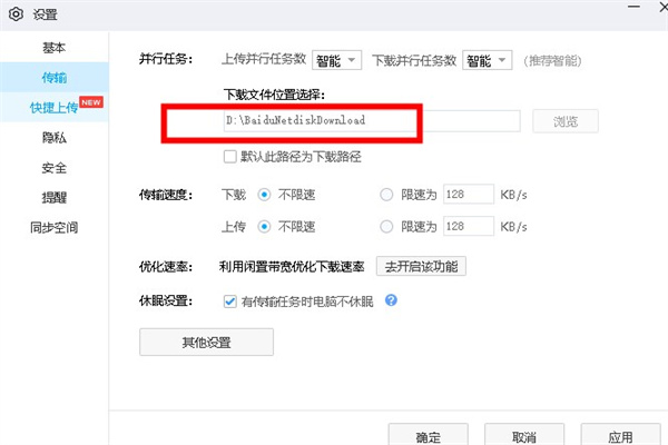 2、点击“传输”,在这里可以看到下载文件位置的选择;