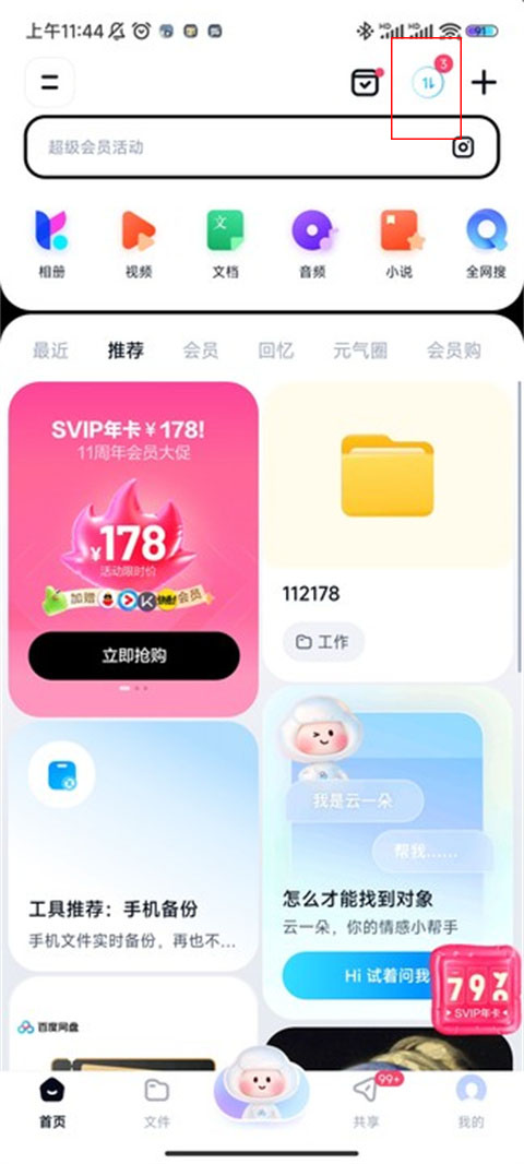 1、首先进入手机版的百度网盘app,点击图下红色框框内的传输图标,右上角。