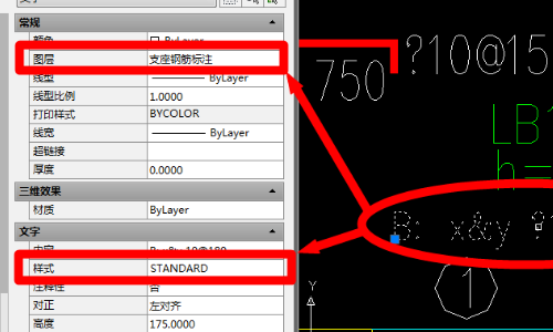 如图所示,其图层为支座钢筋标注,样式为STANDARD