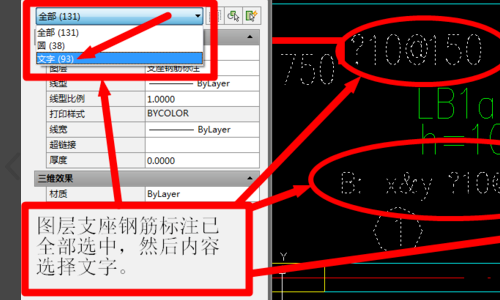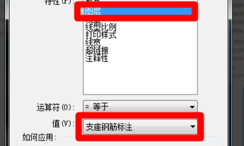 5、然后我们在特性下拉列表中选择图层,在值下拉列表中选择支座钢筋标注。