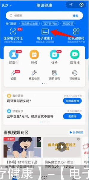接着在【生活服务】栏点击【医疗健康】图标,进入【腾讯健康】页面,再点击上方的【电子健康卡】图标,进入【我的健康卡】页面,申领电子健康卡后,点击页面上的【出示二维码】按钮,进入【我的健康码】页面,